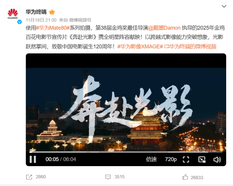 纵观华为与金鸡电影节的合作历程,不难发现Mate系列的影像突破与金鸡短片始终同步演进,从未停步。从华为Mate 60 Pro+创作的《人间小事》凭借全焦段超清影像的物理可变光圈展现出细腻的光影控制力,到华为Mate 70 Pro拍摄的《小岛电影院》首次将多光谱成像技术应用于真实色彩还原——每一部作品都不仅是当年的影像热点,更成为华为在影像理论、硬件与算法协同演进中的关键里程碑。如今,《奔赴光影》以更高的完成度、更复杂的拍摄场景和更细腻的视觉表达,标志着华为Mate 80系列在移动影像领域的又一次跨越式进步,也为华为“影像王中王”的行业定位构筑了坚实的技术根基。
