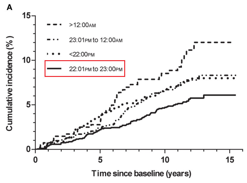 研究纳入了4575名参试者,根据就寝时间将他们分成四组:22:00之前、22:01~23:00、23:01~24:00、24:00以后;随访时间为10.6±3.2年。
